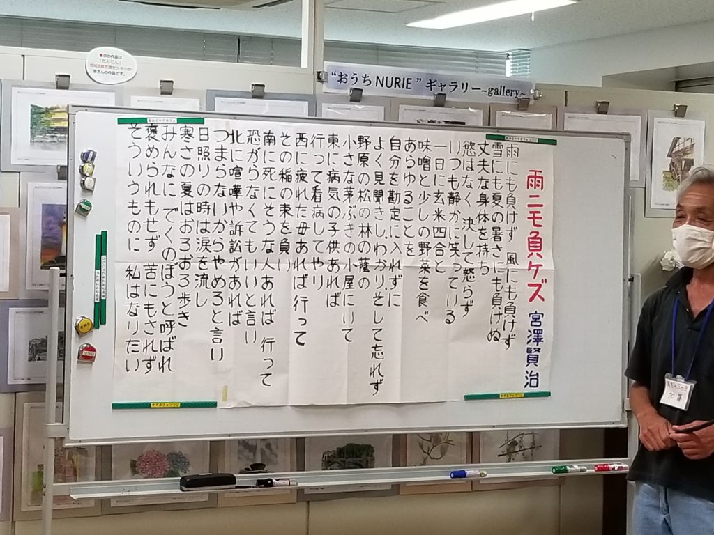 「雨ニモ負ケズ 宮澤賢治」この詩を皆で声を揃えて読みました。久しぶりに読んだ私ですが、何か心にジーンとくるものがありました。