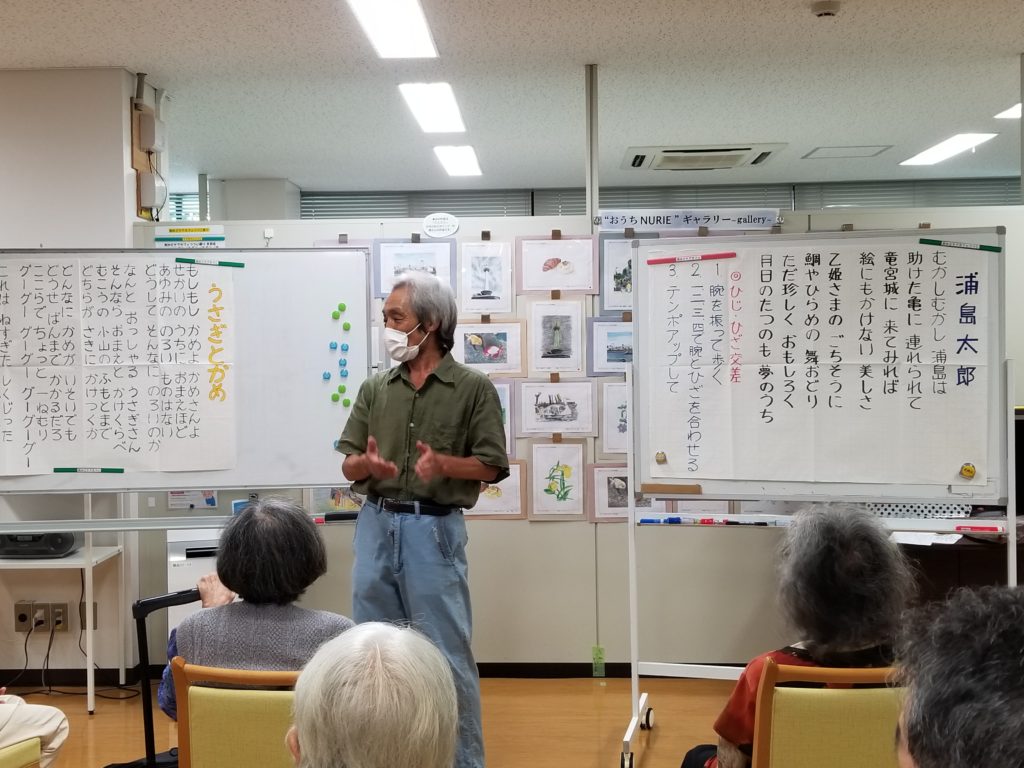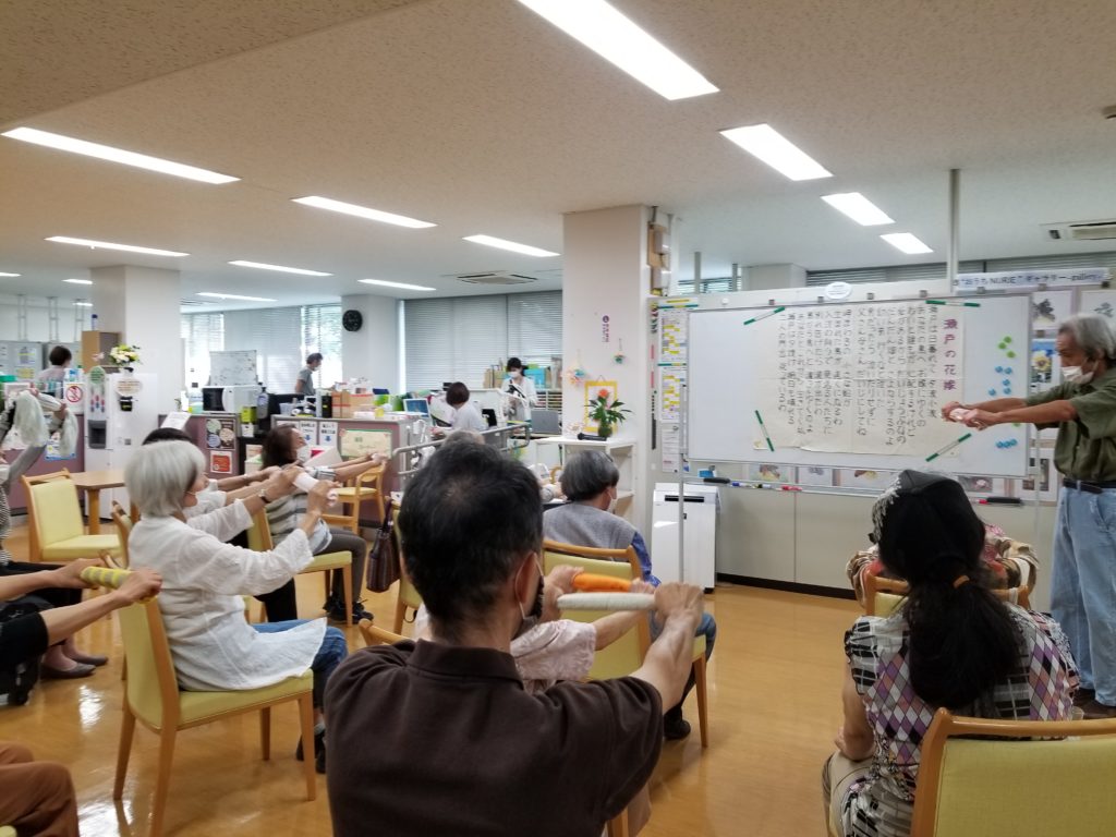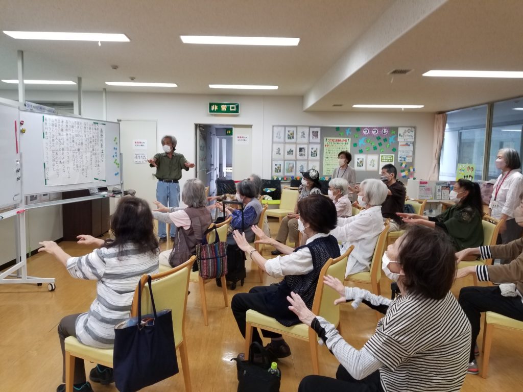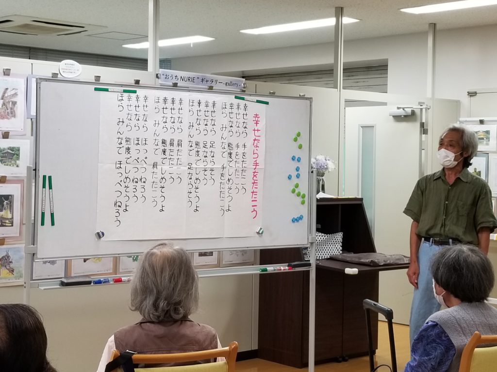 次は加藤さんの音楽レクリエーション。まずは、「高原列車は行く」を歌います。手を脇でグー、前に伸ばしてパーしながら歌います。
