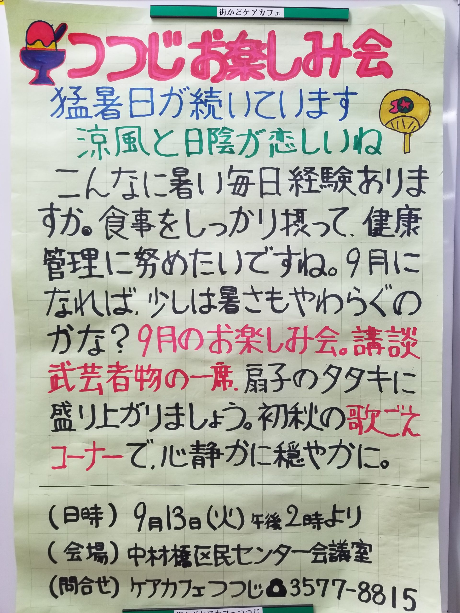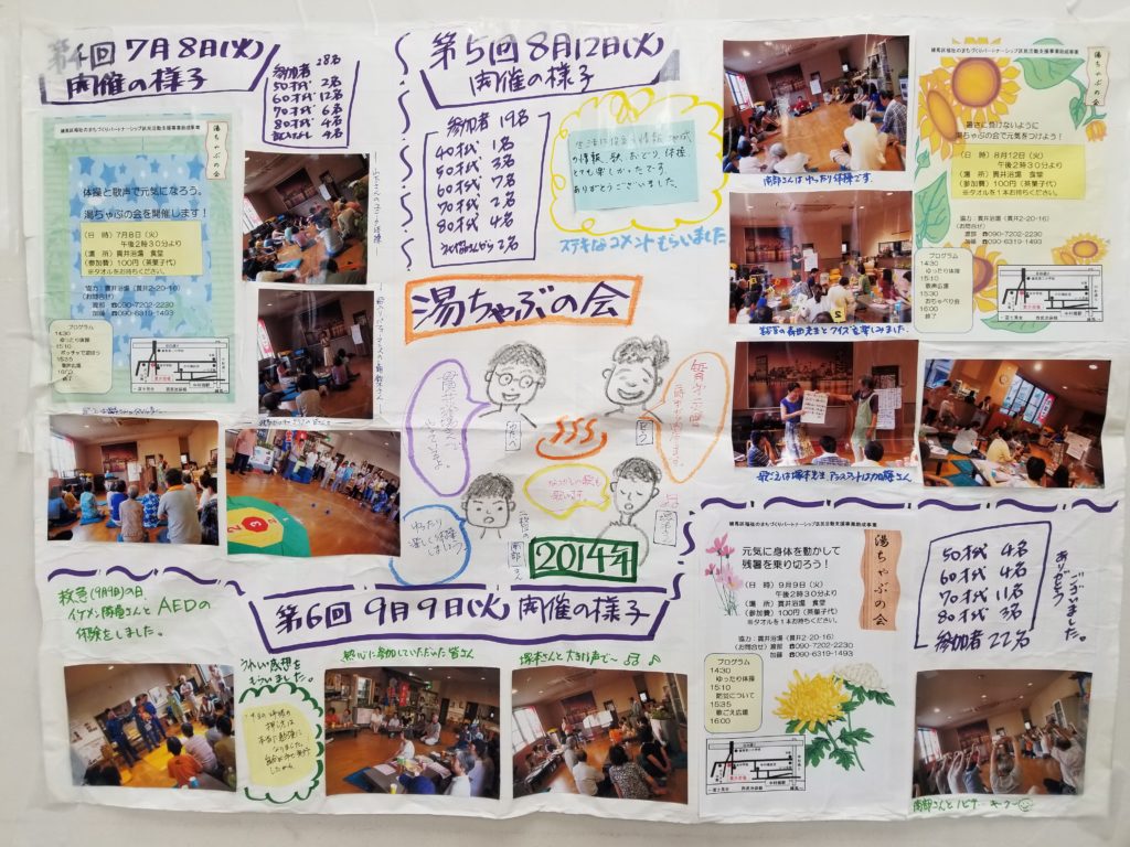 先月から、お楽しみ会の会場に、過去の湯ちゃぶの渡部さんの手書きの模造紙が貼られるようになりました。湯ちゃぶの会を始めた2014年のものです。8年経つのですね。当時から来ていただいていた方にはとても懐かしい思い出ですね。
