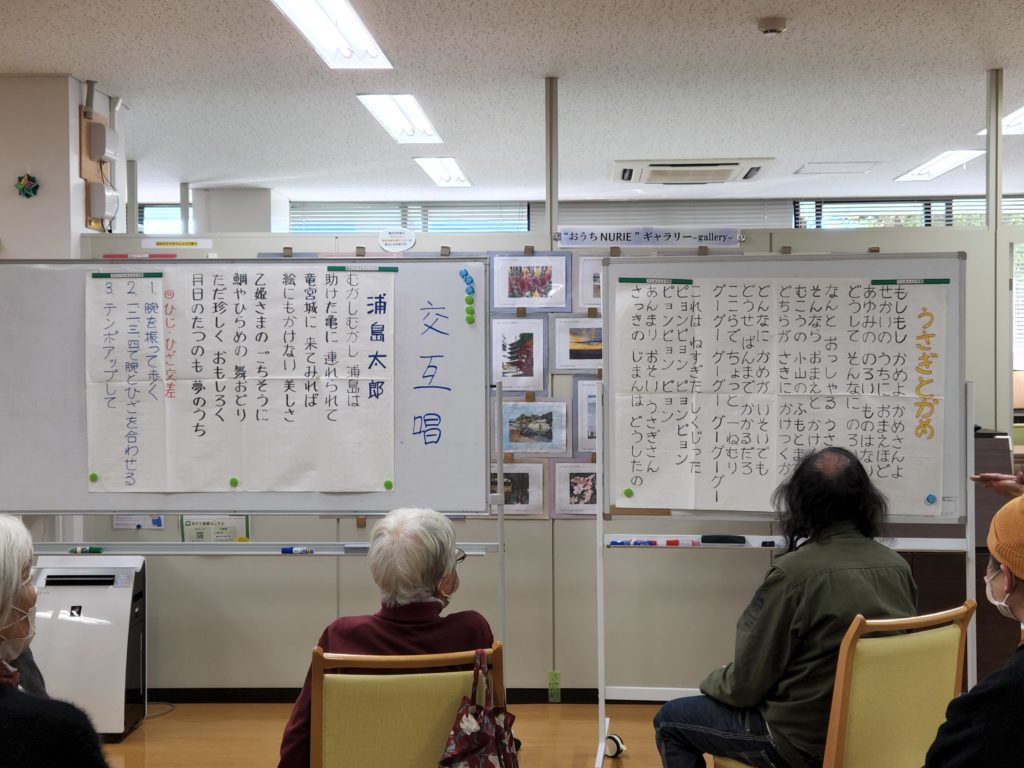 「うさぎとかめ」と「浦島太郎」の交互唄。右チームと左チームで一節ずつ交互に歌っていきます。2番目に歌うチームは、前の歌のメロディーにつられ気味になります。笑って歌いました。