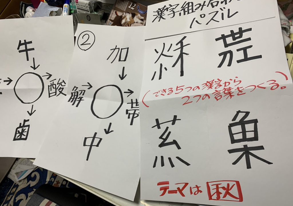 漢字組み合わせパズルを1問、穴あき感じパズルを2問、乳は簡単でしたが、熱はなかなか正解の声が出ませんでした。