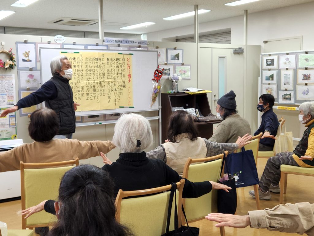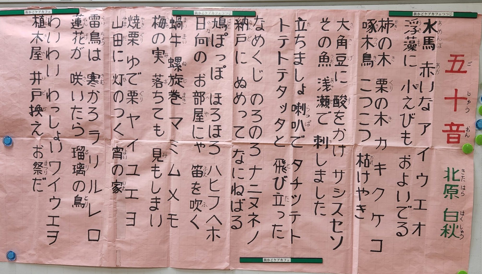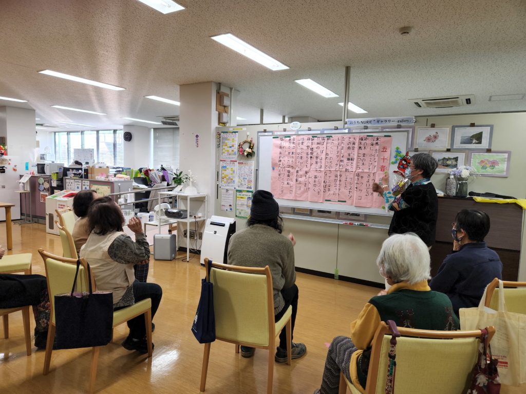 1月24日火曜日、ケアカフェつつじにて今年最初の頭の体操教室。はじめに音読から。北原白秋の「五十音」です。まずは普通に読み、2回目は「アイウエオ」「カキクケコ」のところで手の振りをつけて読みます。