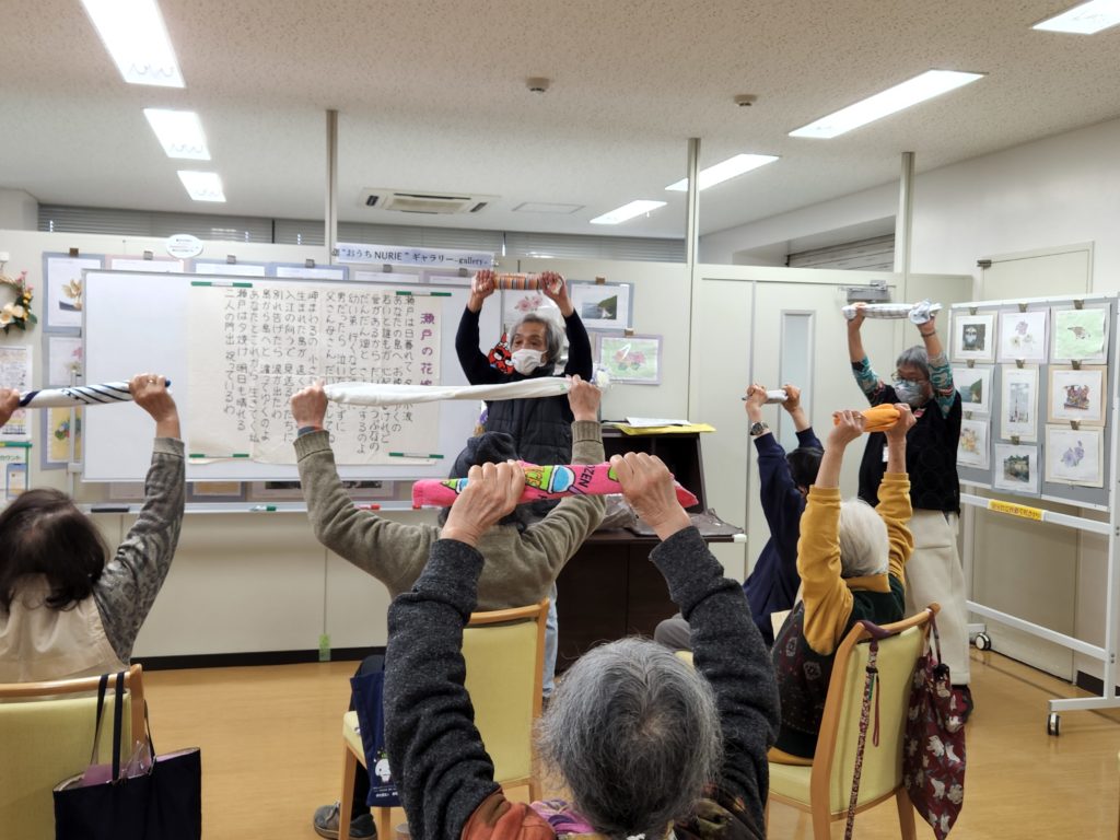 そして「瀬戸の花嫁」これはタオル体操をしながら歌います。タオルを使って手を上げたり回したりねじったり。ストレッチ効果バッチリのタオル体操です。