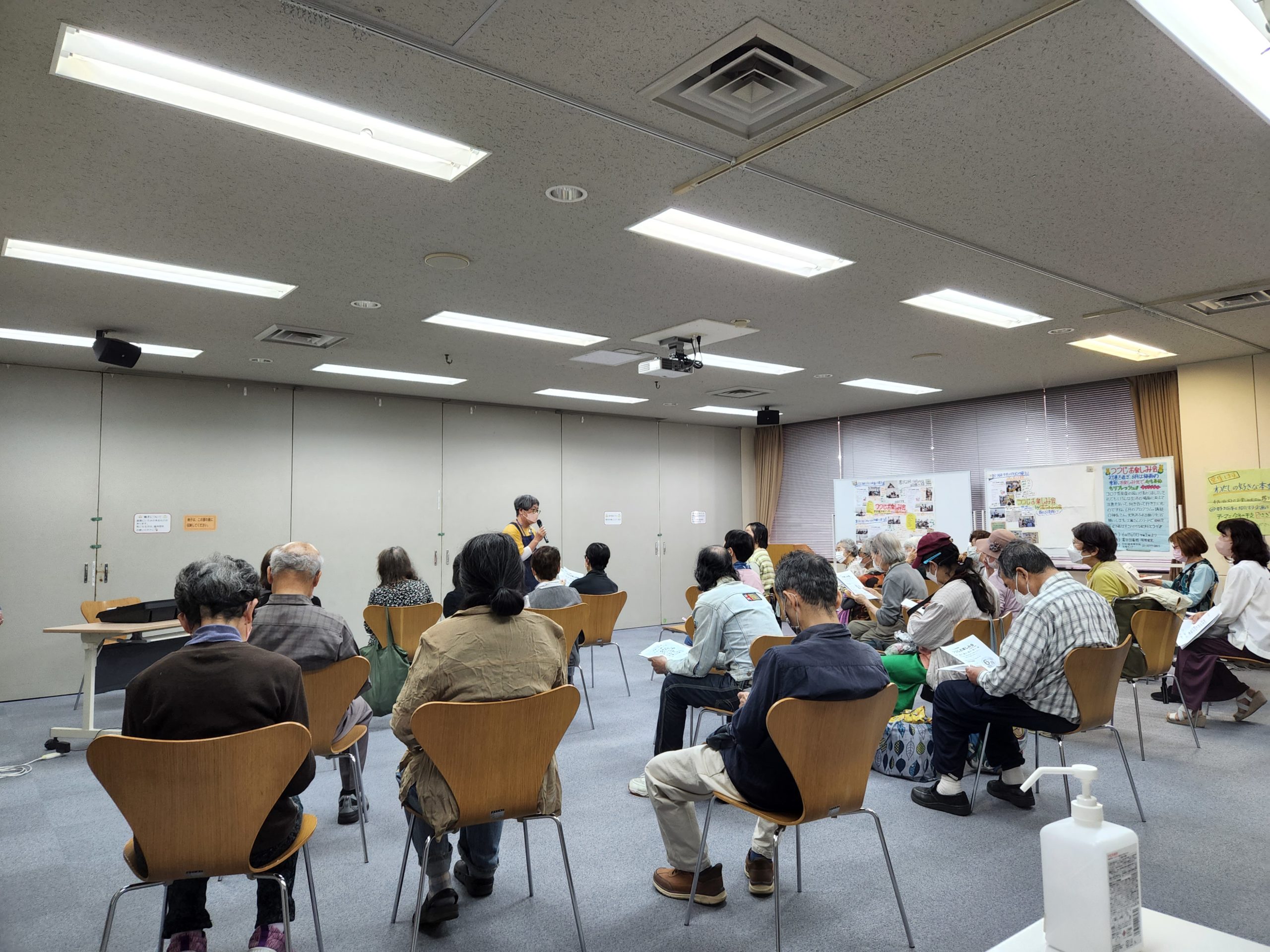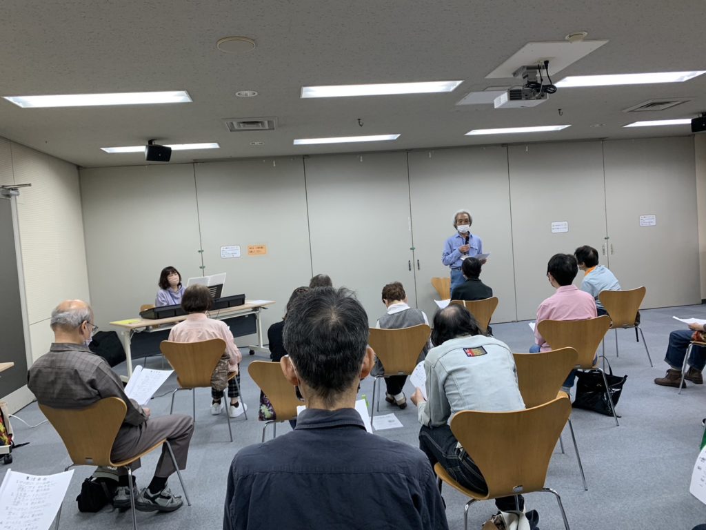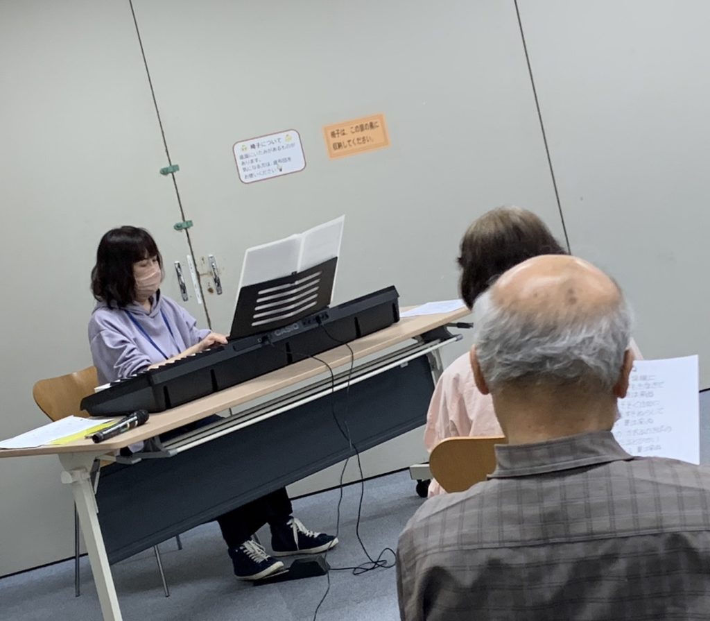 後半は、予定では、さわやかハーモニーさんによる歌声交流だったのですが、前々日に、さわやかハーモニーさんの方がコロナにかかられて来られないと連絡があり、いつも歌声を担当下さっている工藤さんはお仕事でご都合がつかず、急遽わたくし佐々木がピアノの伴奏をさせていただくことになりました。歌声コーナーを進行して下さるのは加藤さんです。