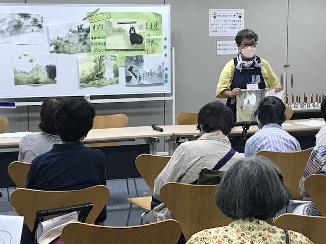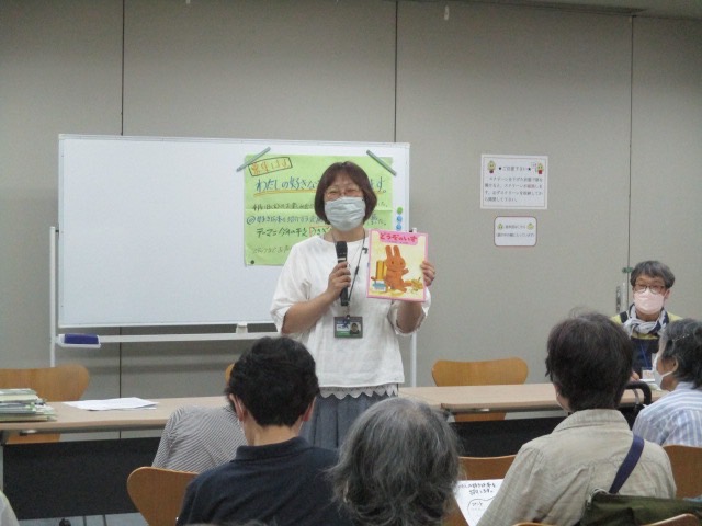 猛暑の中、元気な皆さんに集まってもらい、会場は満席でした。今月のイベントは、ブックトーク。テーマは干支のうさぎ。うさぎの本が集まりました。
